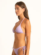 Keep it timeless with OCEAN MYSTERY’s lilac triangle bikini top. Made in soft textured fabric, it features adjustable halter and back ties for a secure fit, with removable padding for customizable support. Pair it with matching lilac bikini bottoms or mix and match for effortless summer style.